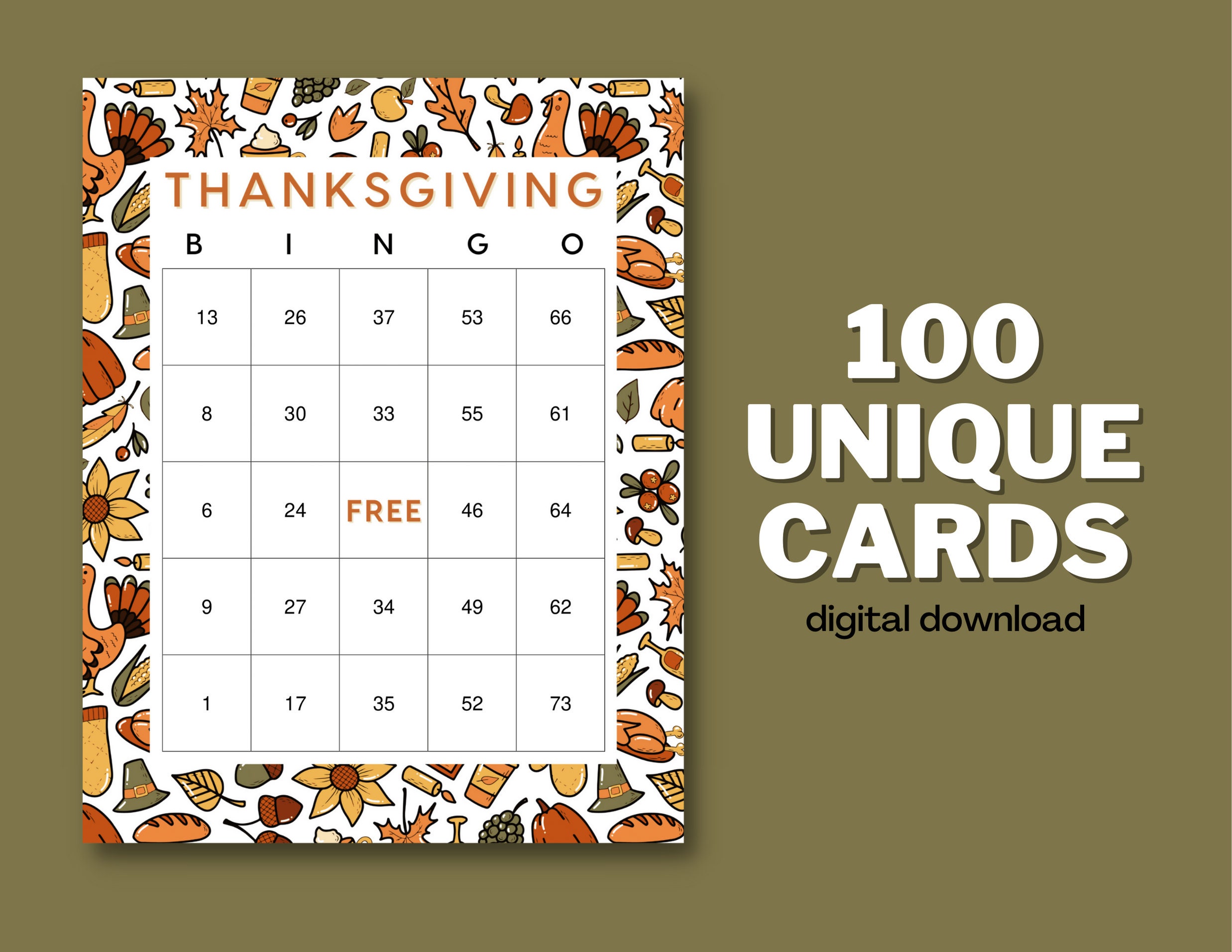 Your Thanksgiving party will be a hit with this fun Thanksgiving bingo game. 100 unique cards are included so you can print as many as you need. Call out the numbers (B1, G47, and so on) until someone gets 5 in a row.