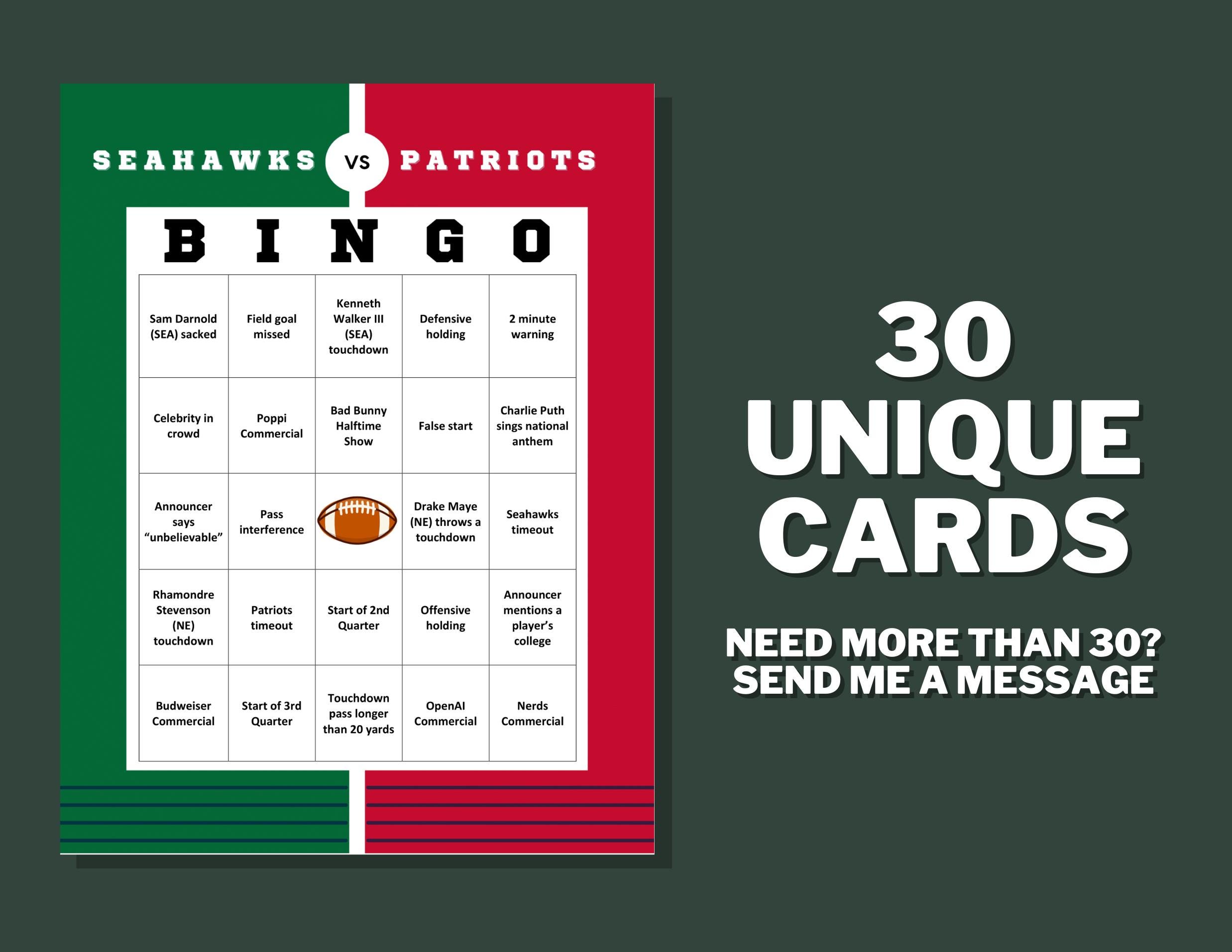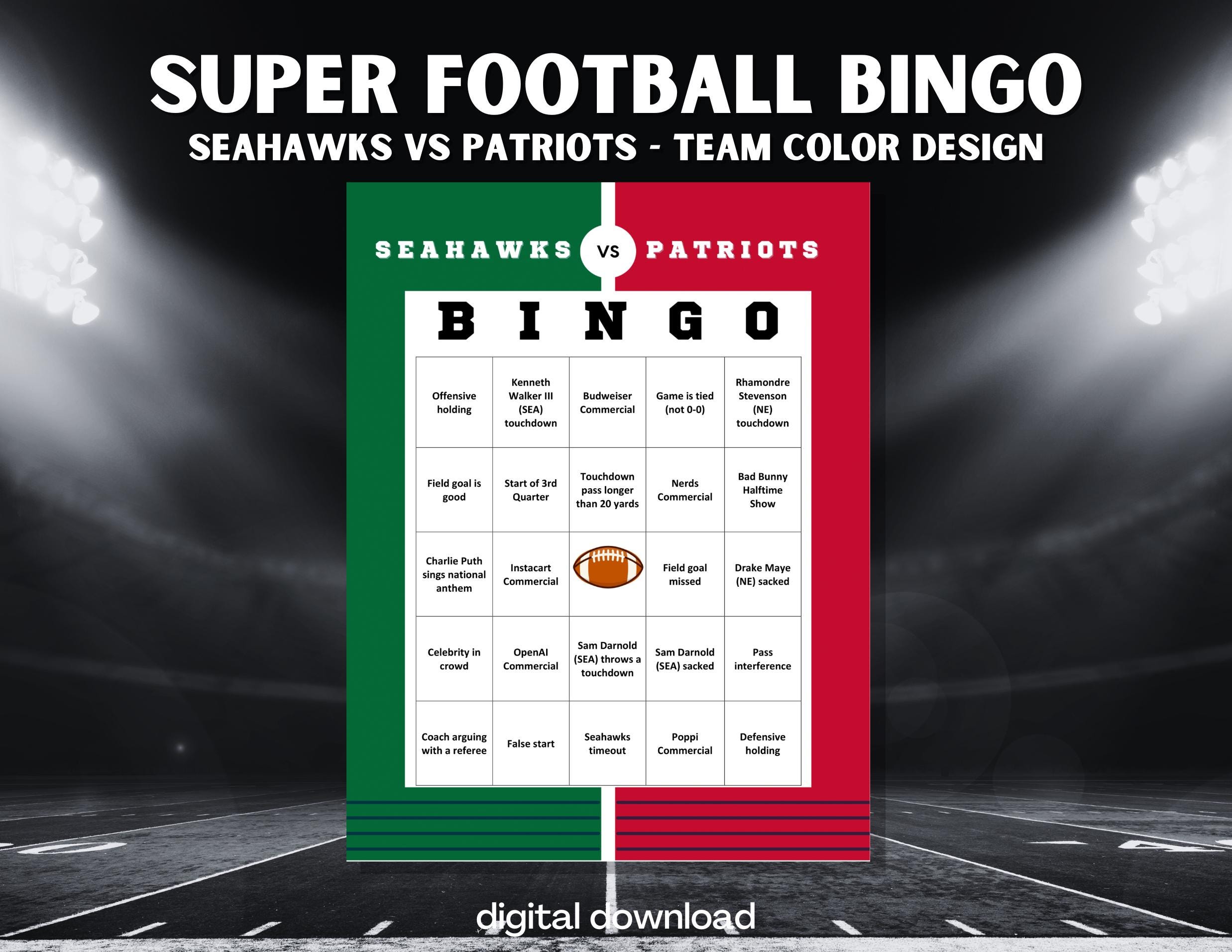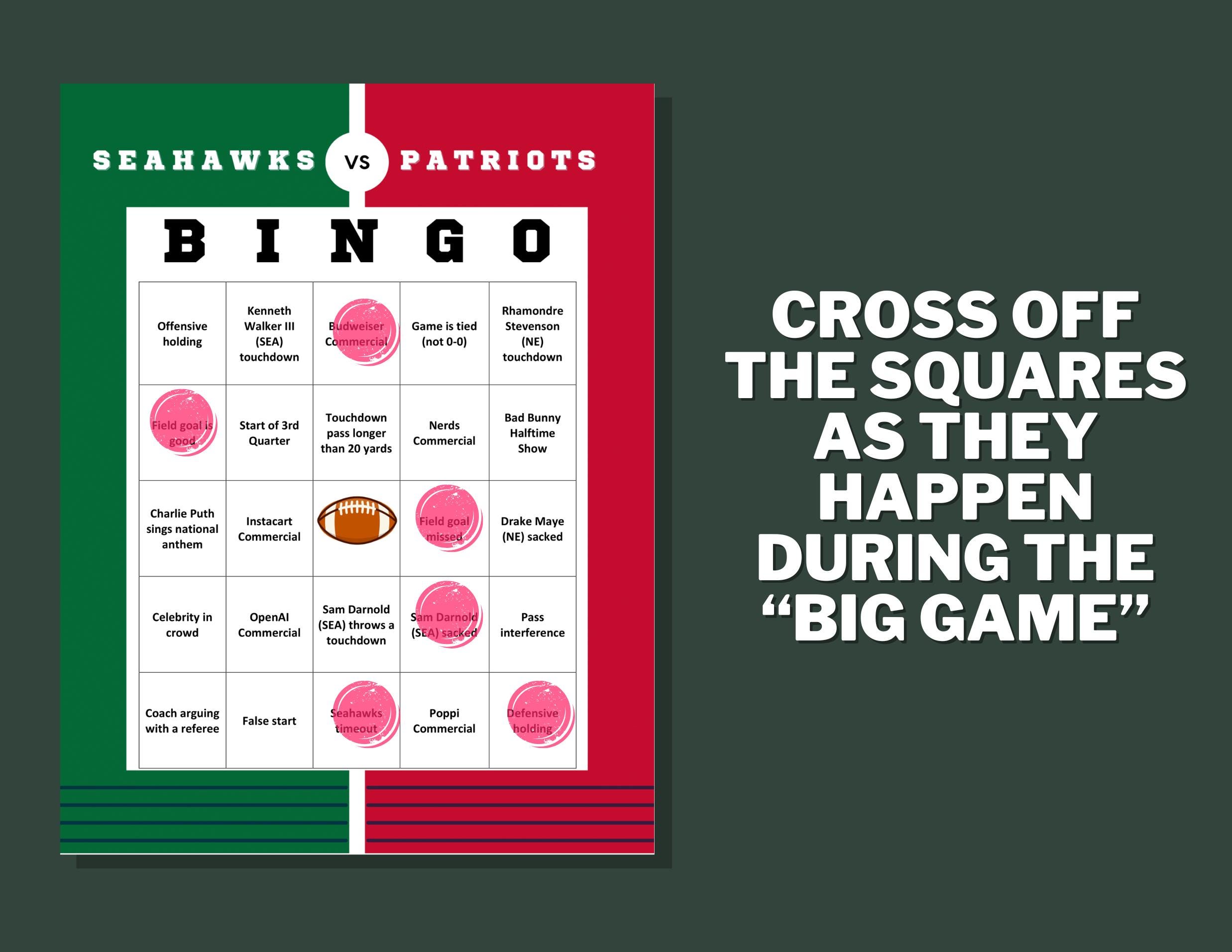 This Big Game Bingo is designed to be played with 2–30 players while watching The Big Game on February 8, 2026, featuring the Seahawks vs. Patriots.