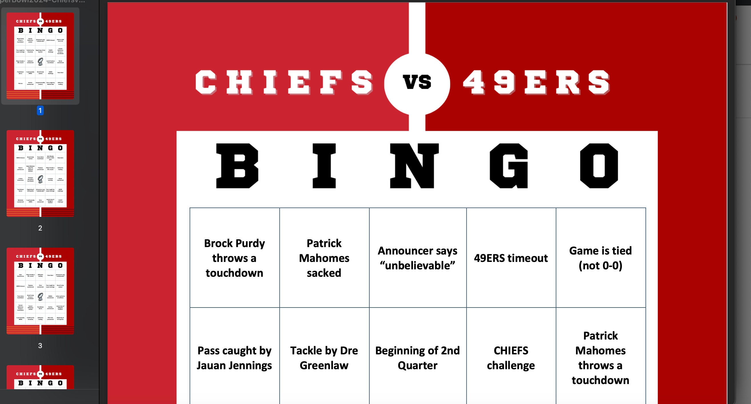We're all hyped for the Super Bowl party after downloading and printing the "Super Big Bowl Game Bingo"! It's Chiefs vs. 49ers themed, and getting it ready was a breeze. The download came through instantly, and printing at home meant we could customize the number of cards for our crew. Seeing the team colors pop on our prints has everyone buzzing for game day. The idea of mixing football action with a dash of bingo fun is genius. It's got us all talking about how this game is going to be a highlight, not just for the football fans but for everyone looking for a good time. Major props for making our Super Bowl party planning both easy and exciting. Counting down the days until we shout "Bingo!" alongside touchdowns!