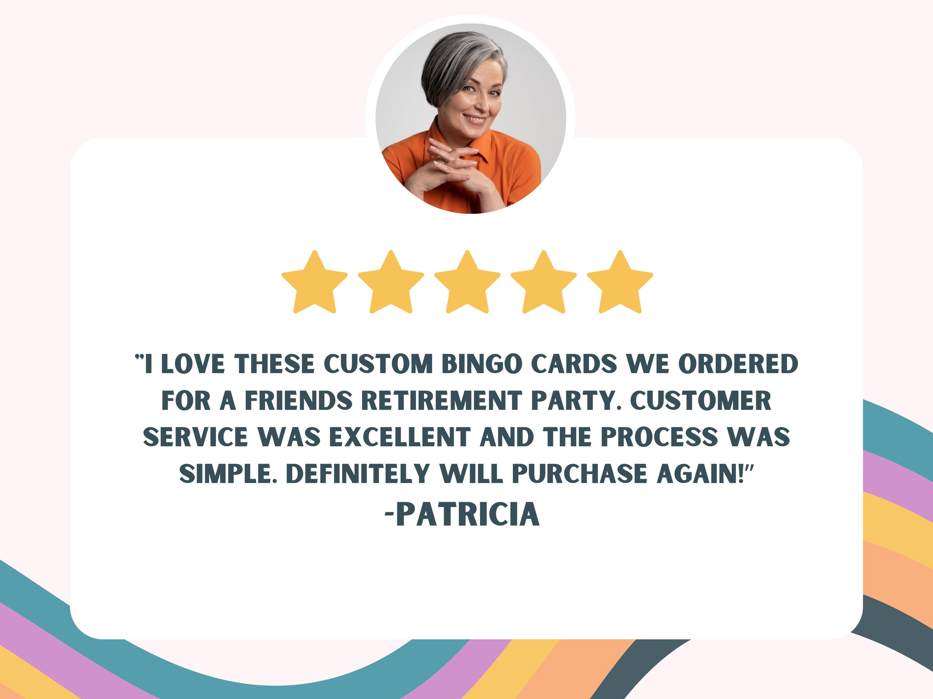 I love these custom BINGO cards we ordered for a friends retirement party. Customer service was excellent and the process was simple. Definitely will purchase again!