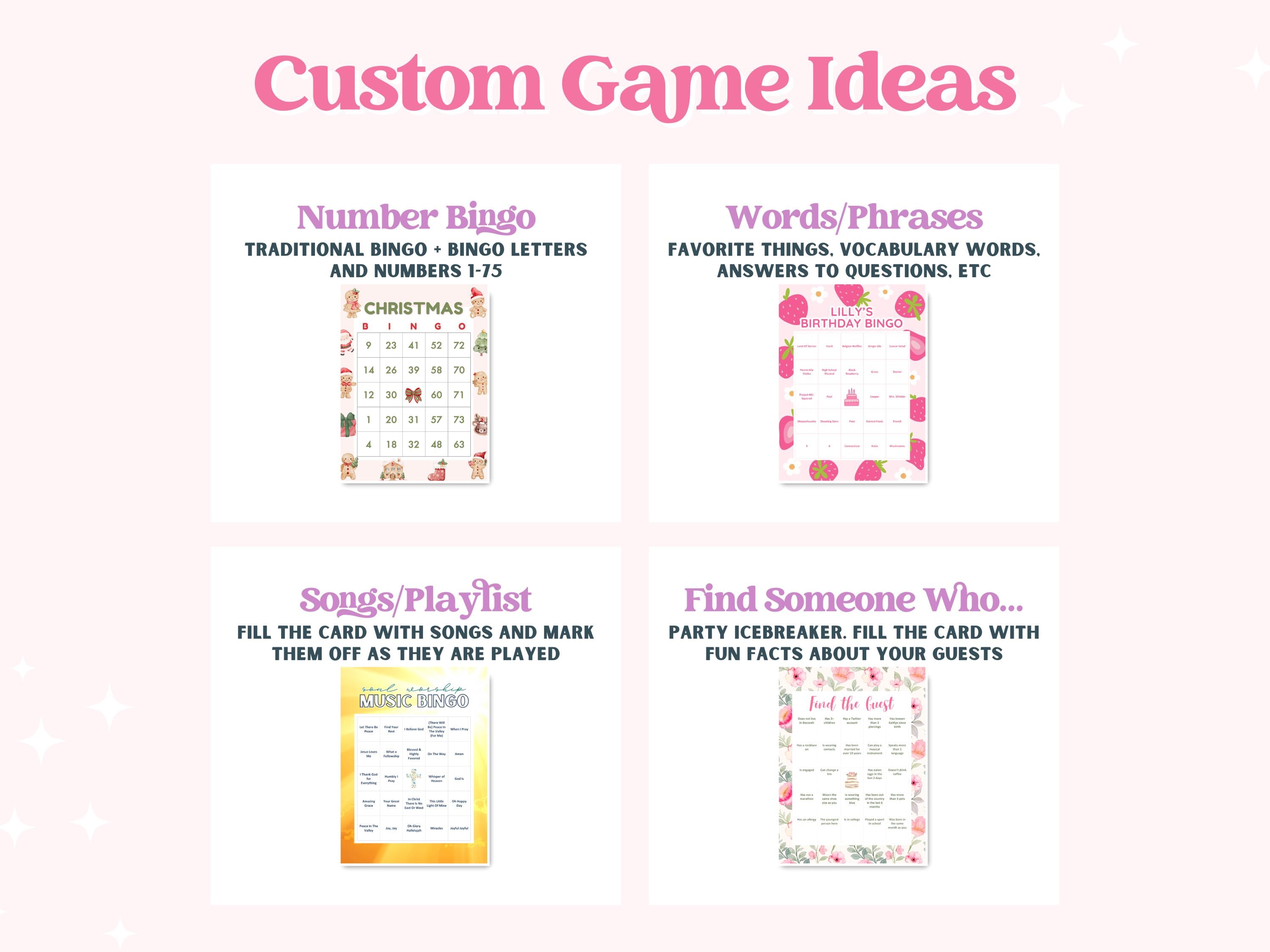 Simply give us 24+ words or phrases and we will create 90 unique bingo cards for you. We randomize all of your words so no two cards are the same. We can also offer traditional number bingo with numbers 1-75.