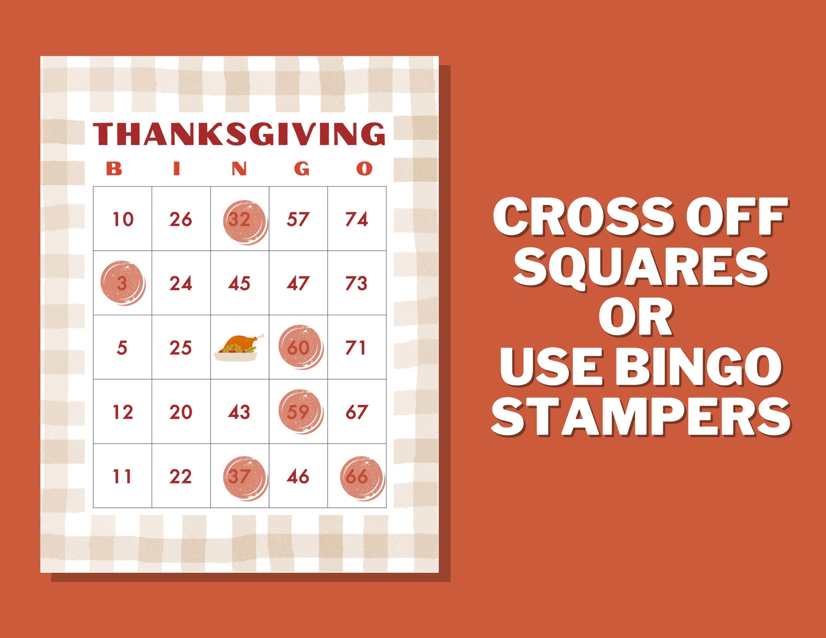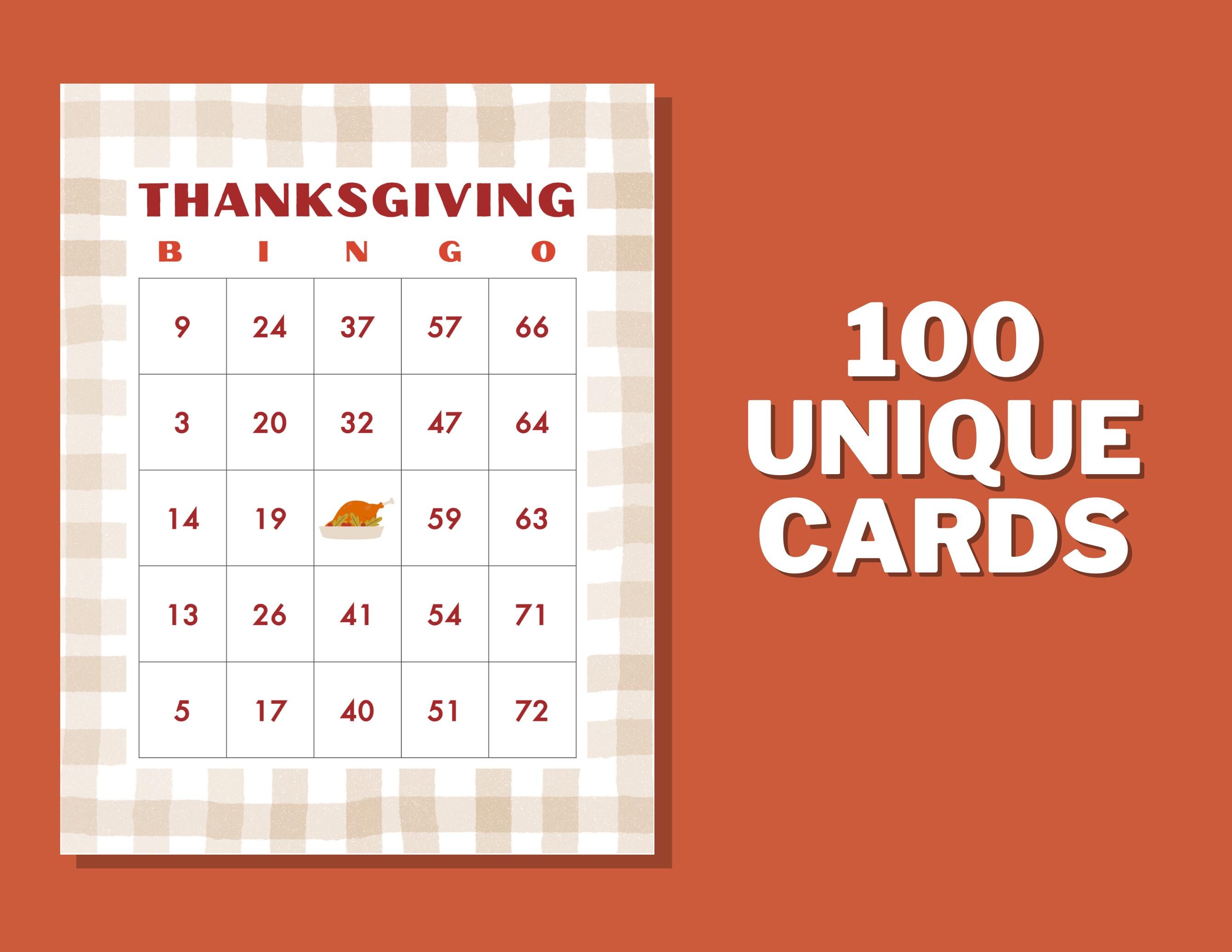 Gather family and friends for a memorable Thanksgiving celebration with our set of 100 unique number bingo cards. Instantly downloadable and easy to print, these cards bring extra joy to your holiday gathering. Whether it's a big family dinner or a cozy get-together, print as many as you need for endless fun!