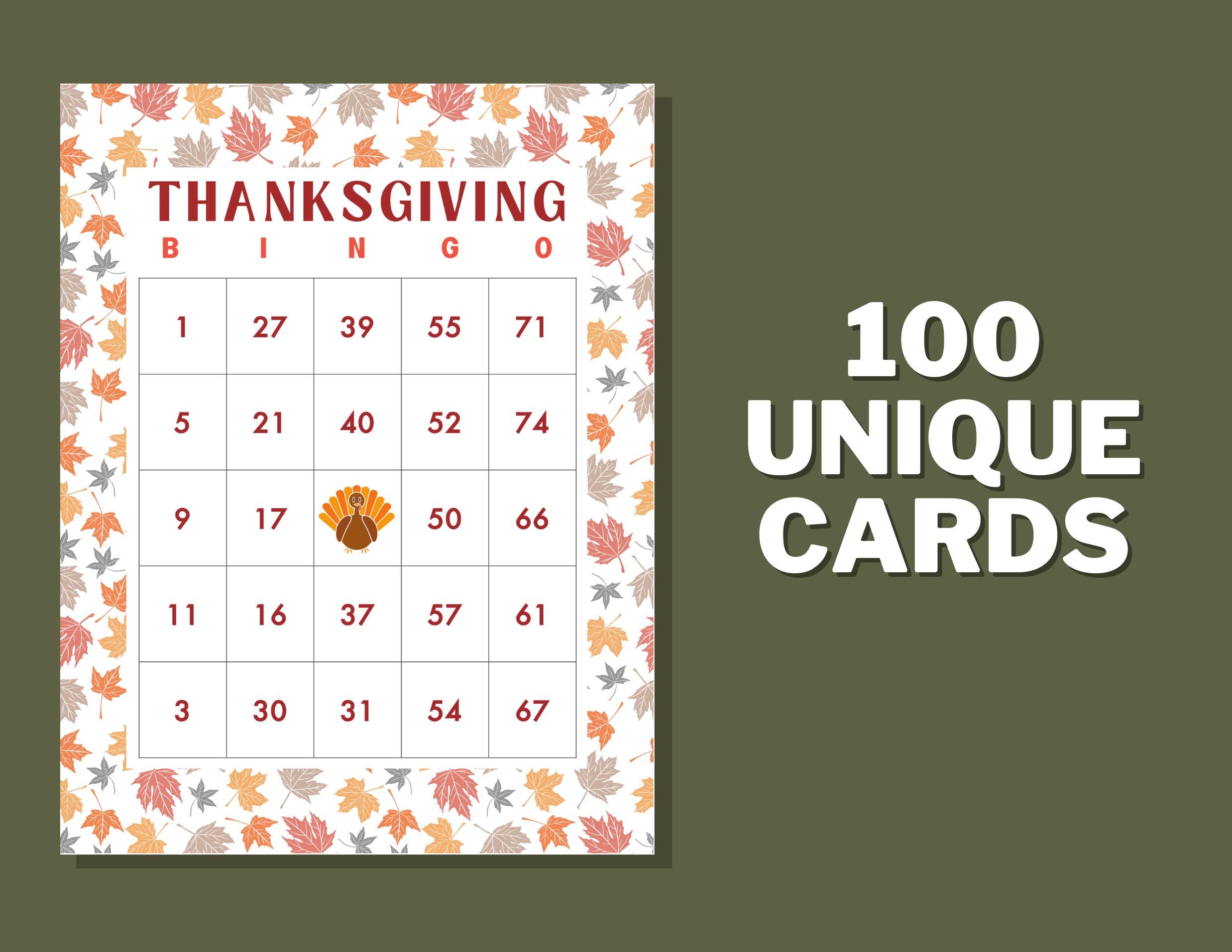 Gather family and friends for a memorable Thanksgiving celebration with our set of 100 unique number bingo cards. Instantly downloadable and easy to print, these cards bring extra joy to your holiday gathering. Whether it's a big family dinner or a cozy get-together, print as many as you need for endless fun!