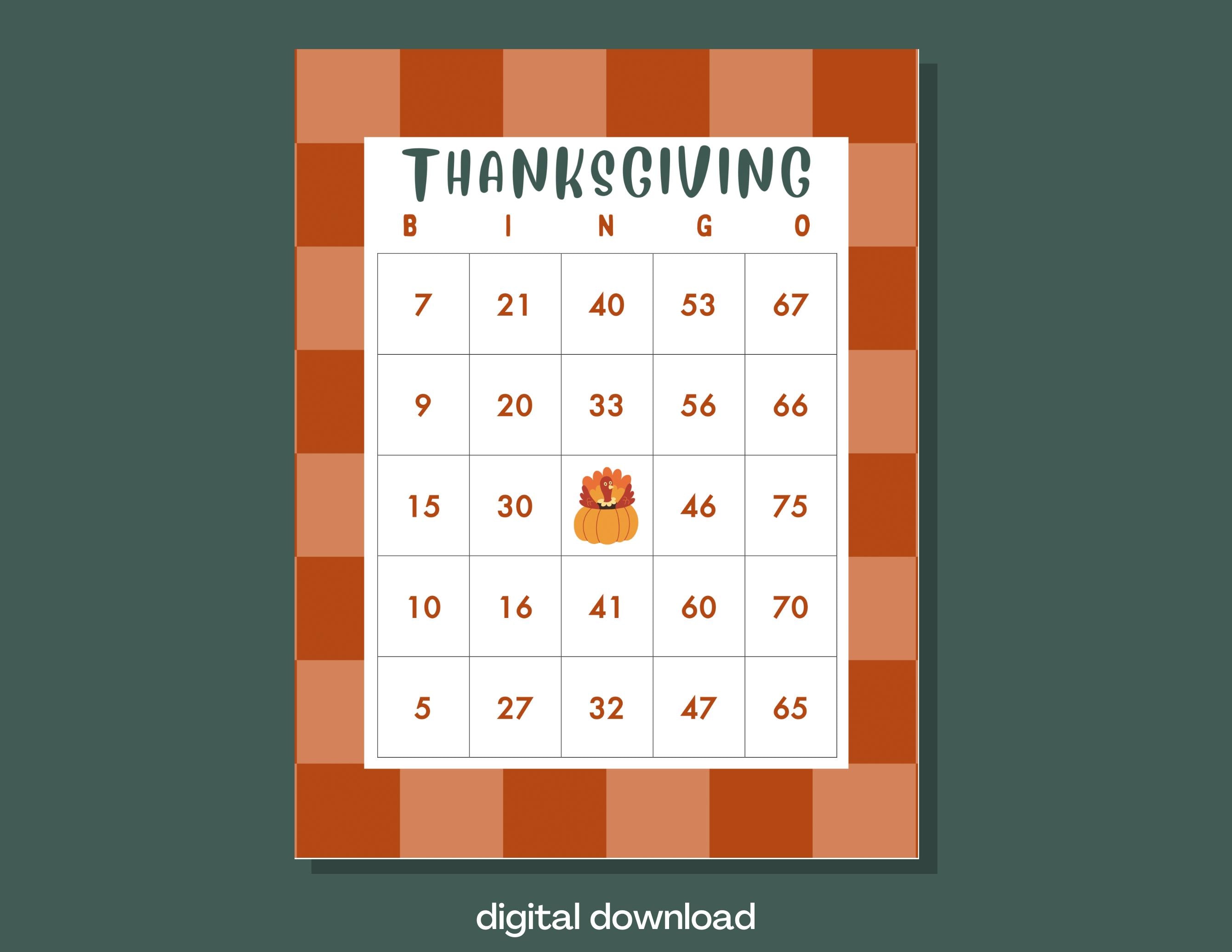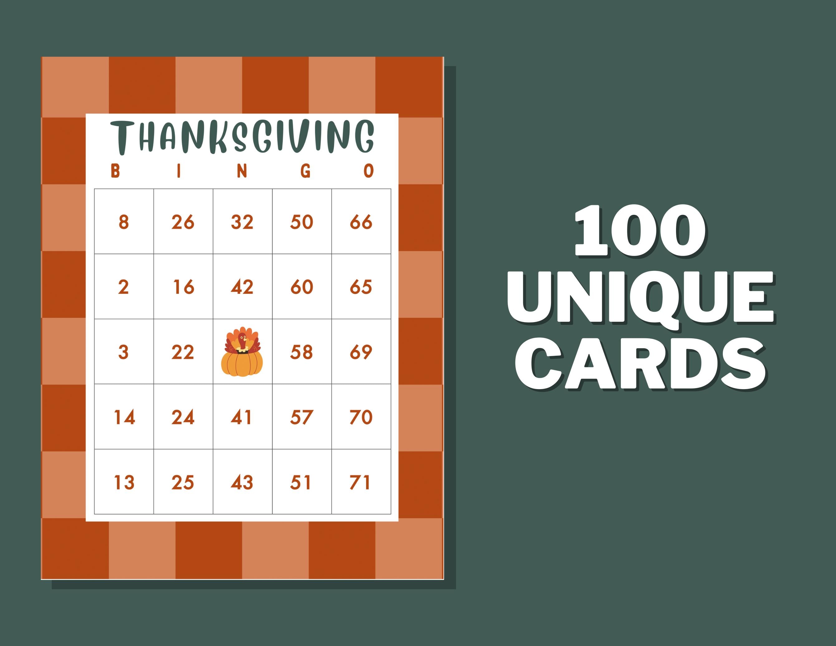 Gather family and friends for a memorable Thanksgiving celebration with our set of 100 unique number bingo cards. Instantly downloadable and easy to print, these cards bring extra joy to your holiday gathering. Whether it's a big family dinner or a cozy get-together, print as many as you need for endless fun!