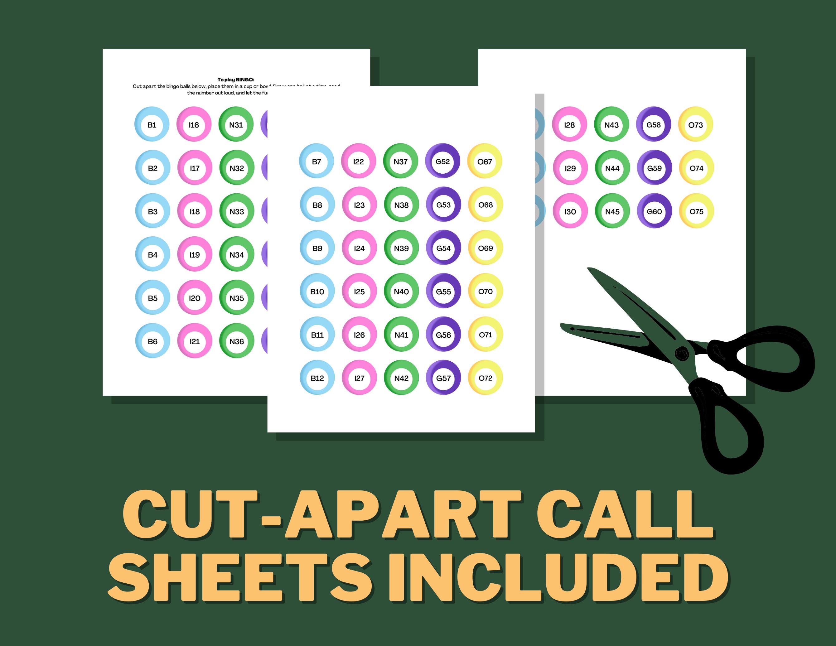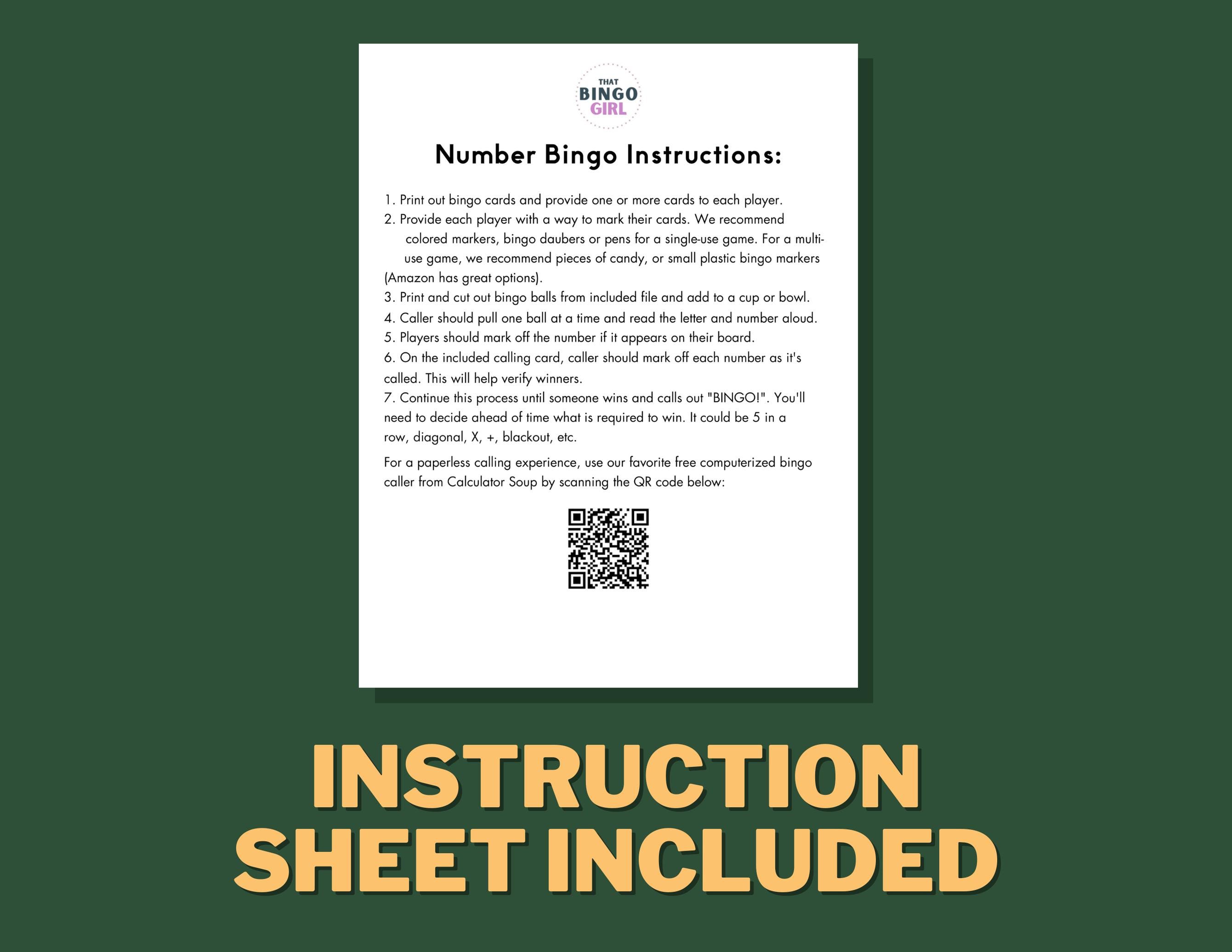 1 PDF call sheet (Cut apart the numbers and draw at random to play, or use a traditional bingo set)