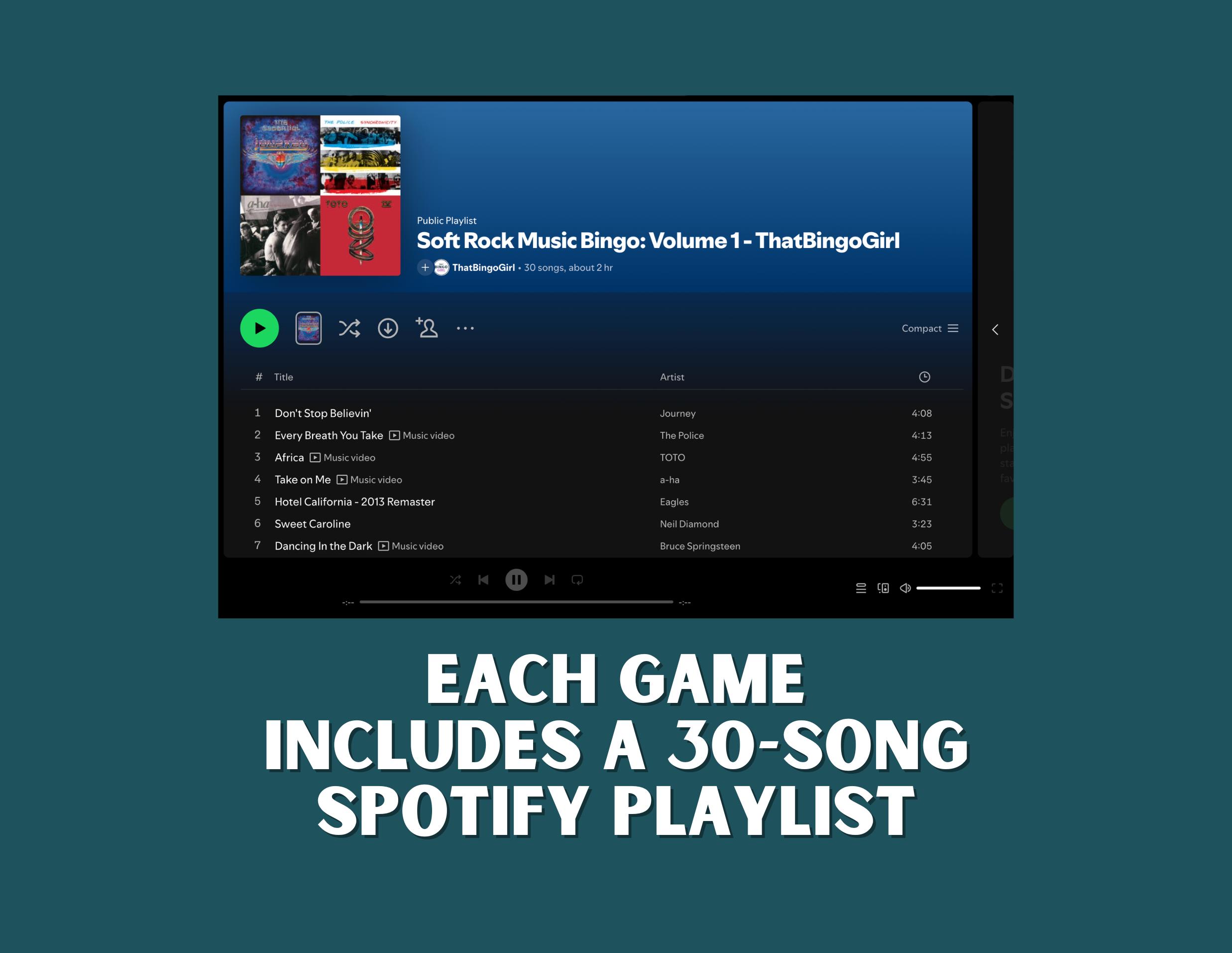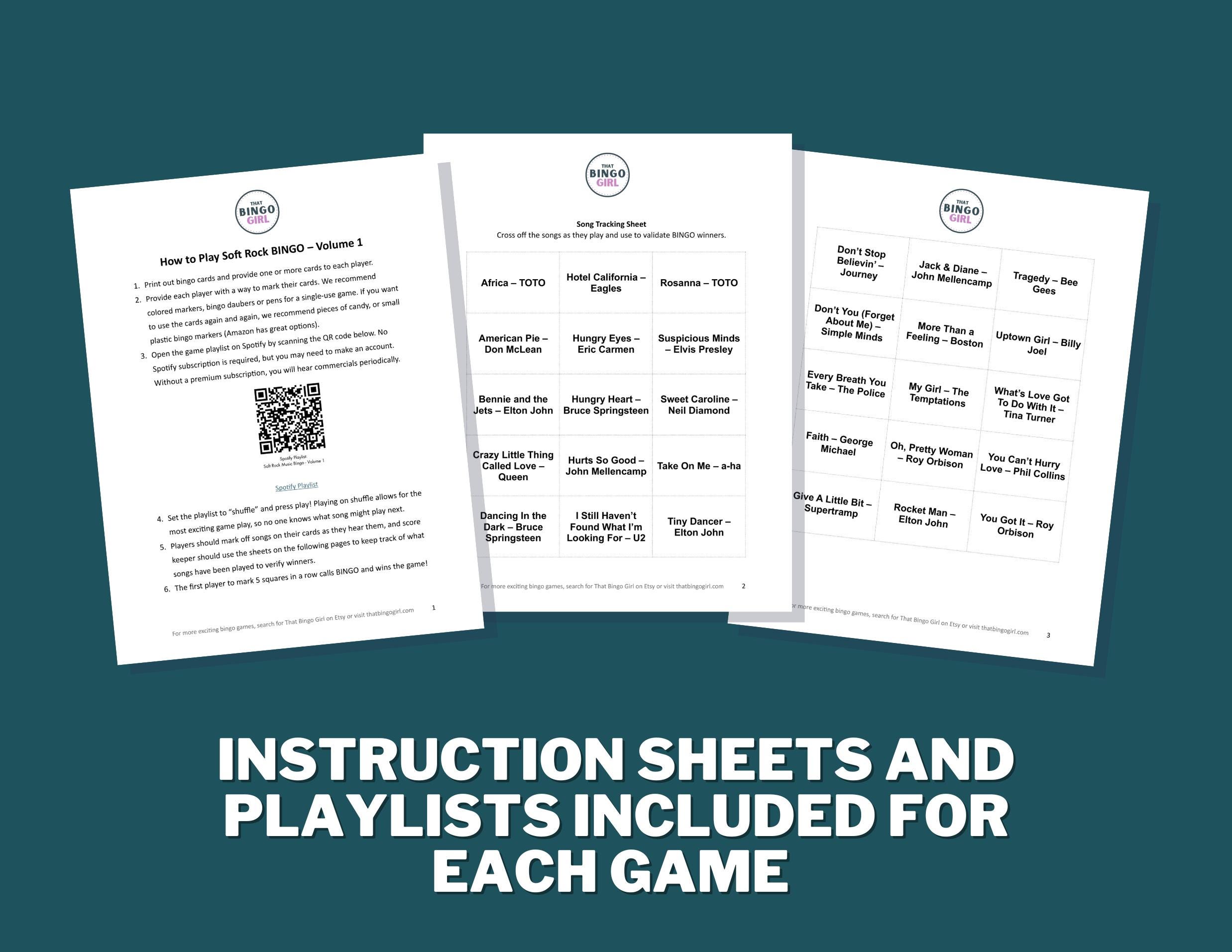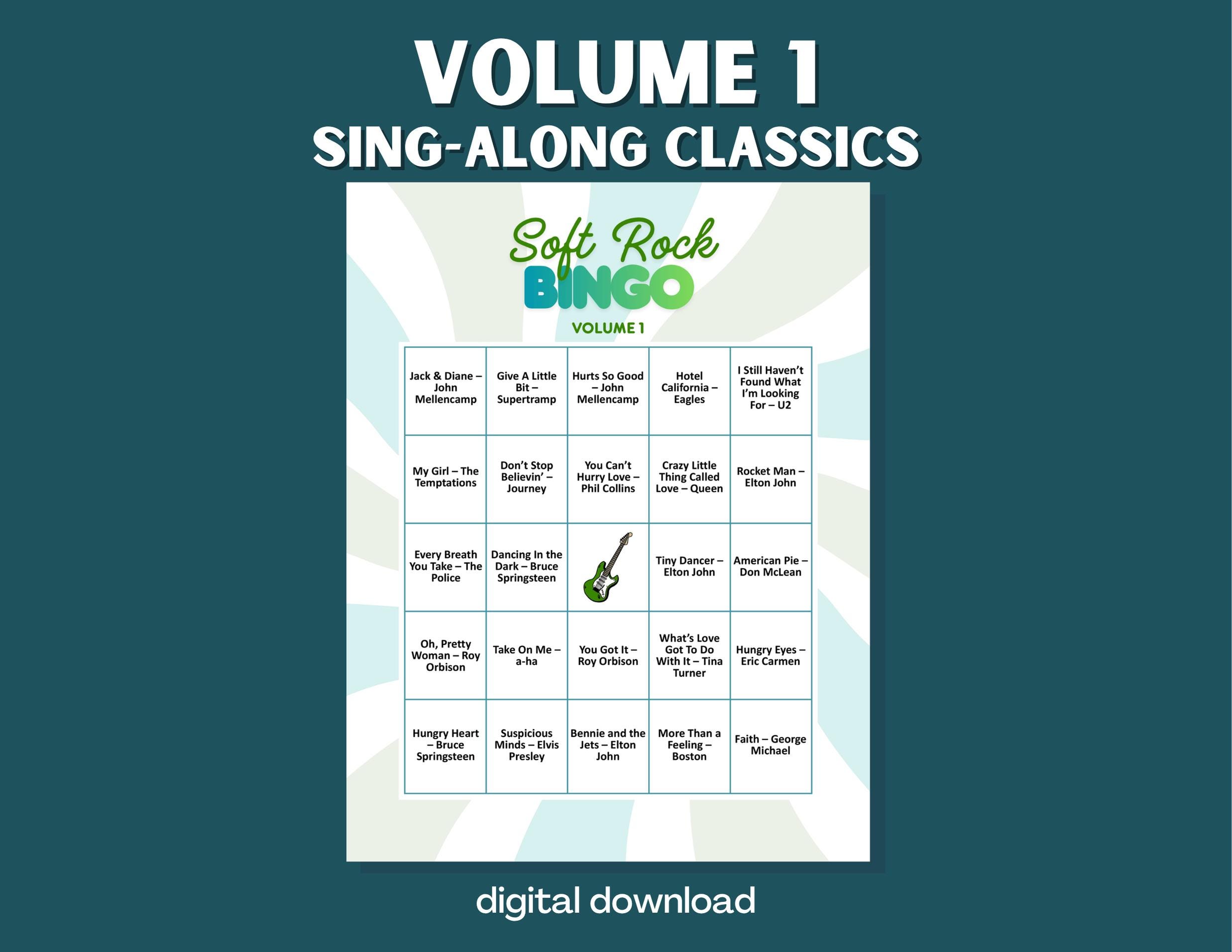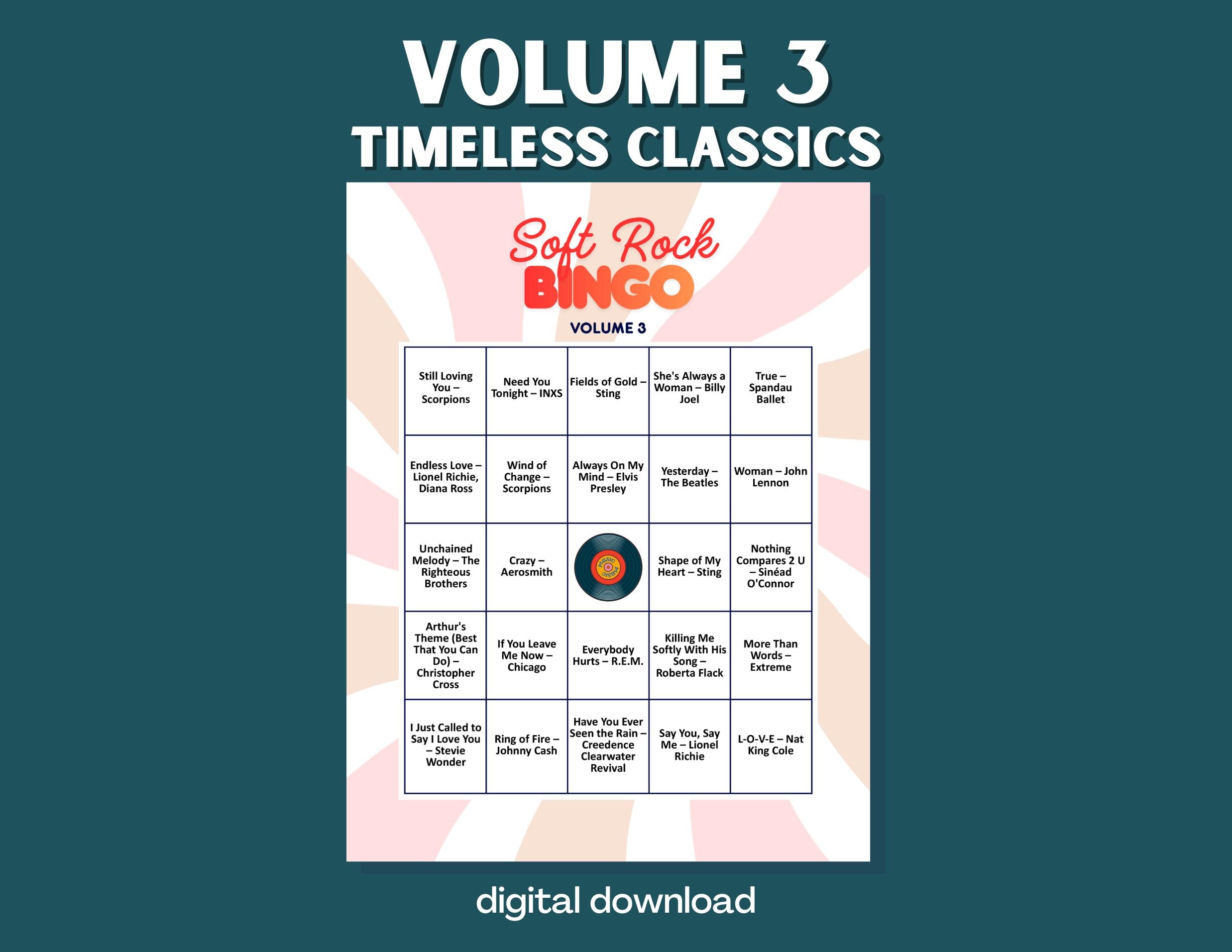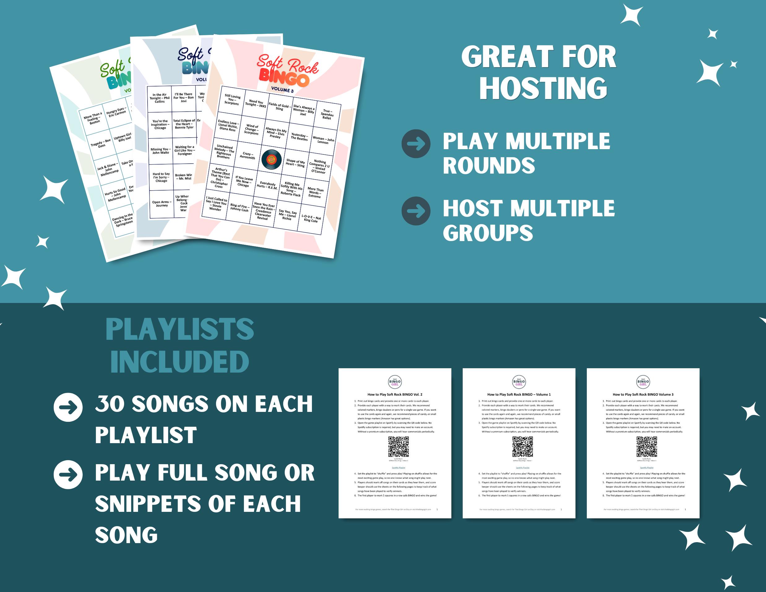 Soft Rock Music Bingo Bundle includes Volumes 1–3 of this printable music bingo party game, featuring 90 total songs across 3 unique playlists for extended gameplay. Perfect for larger groups or multiple game nights with no repeat songs.