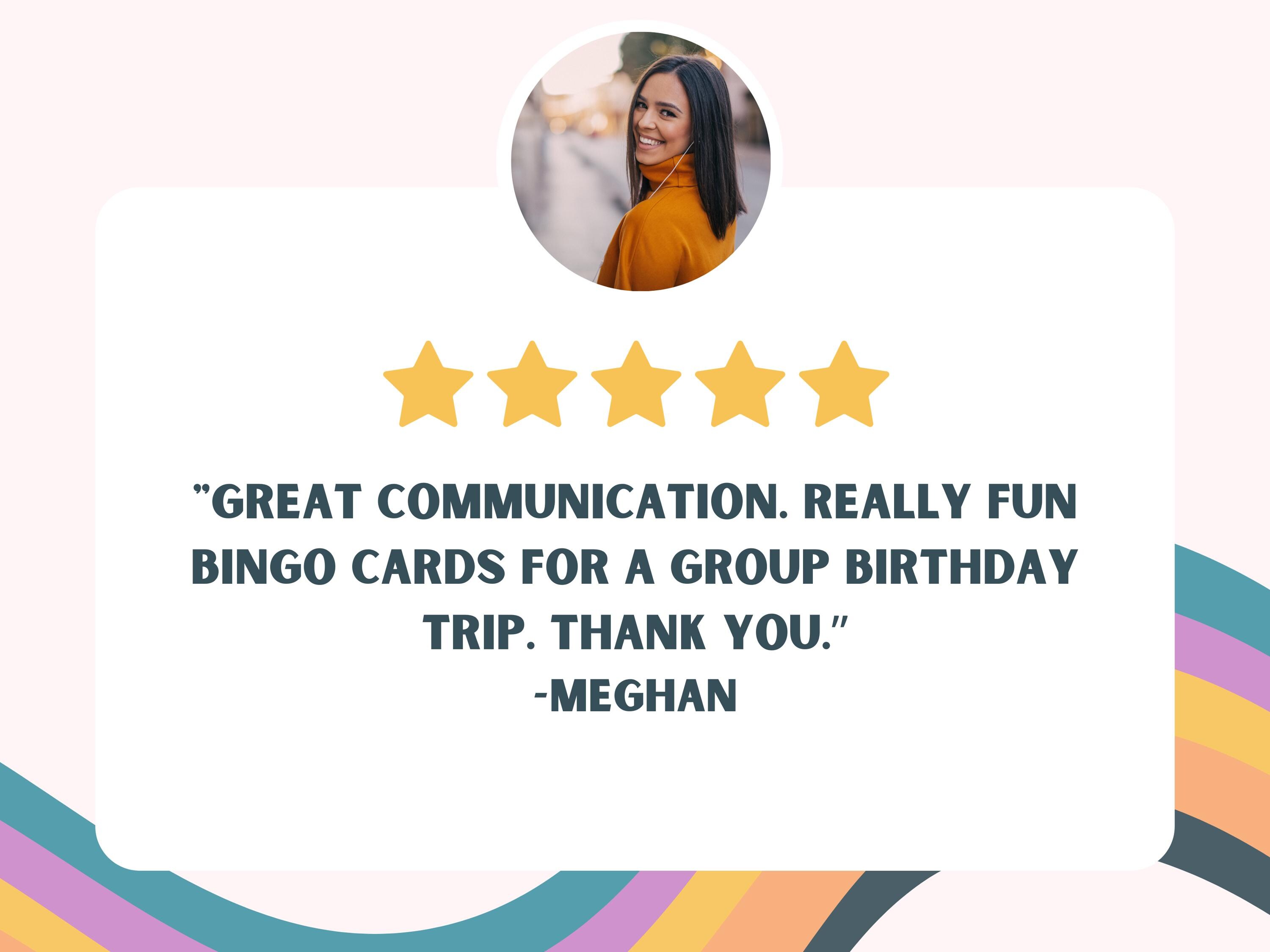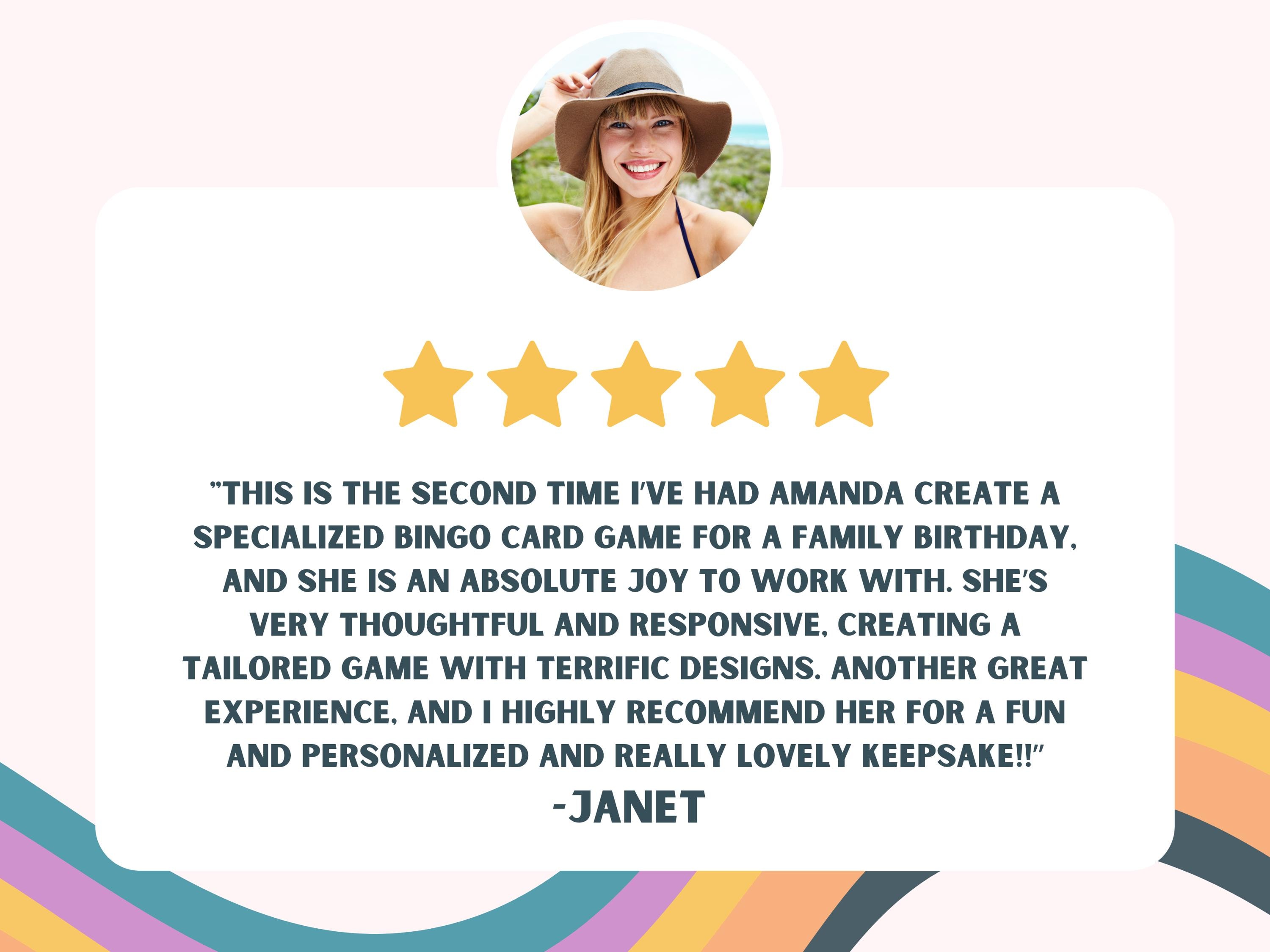 This is the second time I’ve had Amanda create a specialized bingo card game for a family birthday, and she is an absolute joy to work with. She’s very thoughtful and responsive, creating a tailored game with terrific designs. Another great experience, and I highly recommend her for a fun and personalized and really lovely keepsake!!